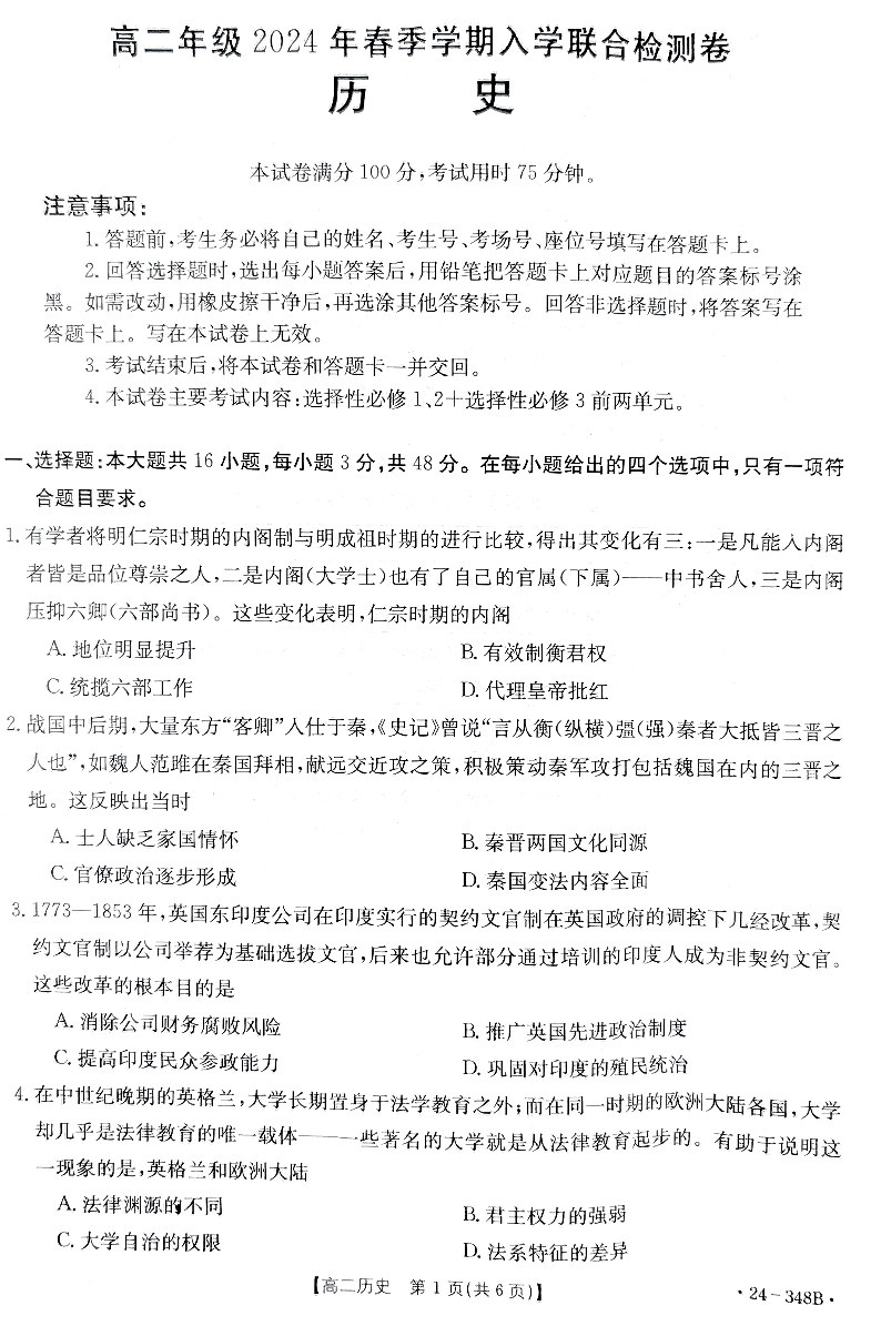 广西壮族自治区桂林市联考2023-2024学年高二下学期开学考试历史
