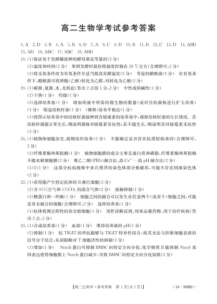 河北省保定市部分高中2023-2024学年高二下学期3月月考生物答案