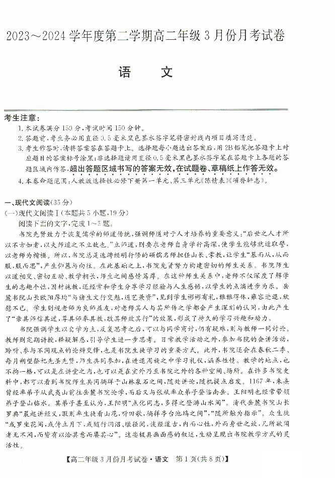 河北省沧州市沧州十校2023—2024学年高二下学期3月月考语文+答案