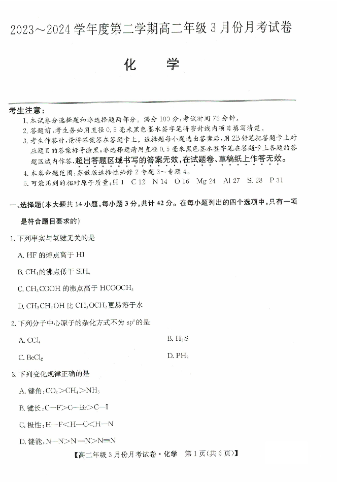 河北省沧州市沧州十校2023—2024学年高二下学期3月月考化学+答案