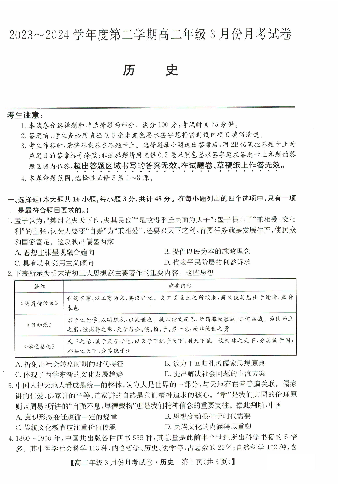 河北省沧州市沧州十校2023—2024学年高二下学期3月月考历史+答案