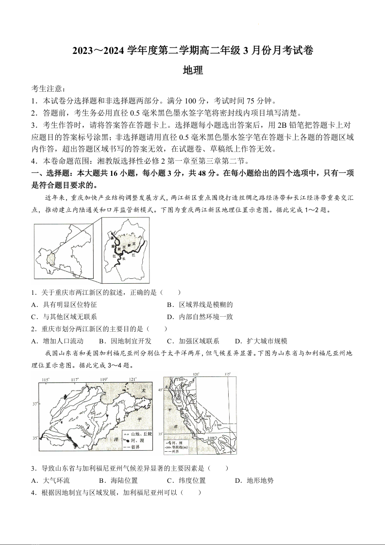 河北省沧州市沧州十校2023—2024学年高二下学期3月月考地理+答案