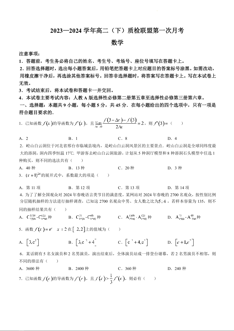 河北省邢台市名校联盟2023-2024学年高二下学期3月月考数学+答案