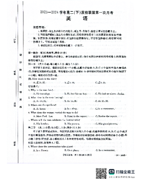 河北省邢台市名校联盟2023-2024学年高二下学期3月月考英语