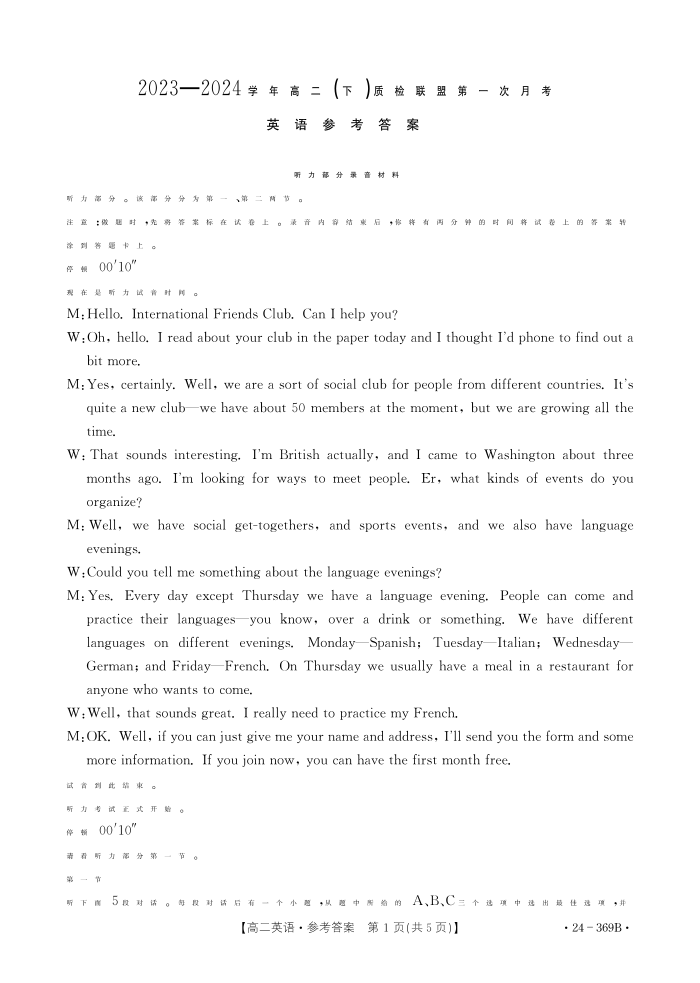 河北省邢台市名校联盟2023-2024学年高二下学期3月月考英语答案