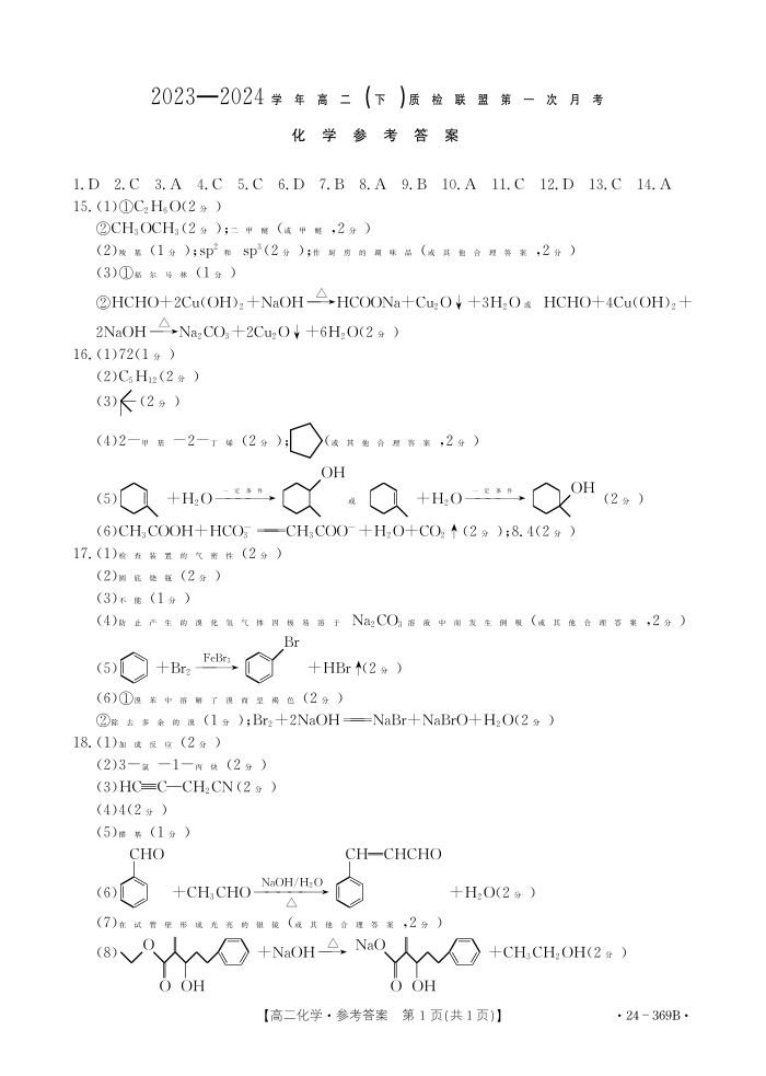河北省邢台市名校联盟2023-2024学年高二下学期3月月考化学答案