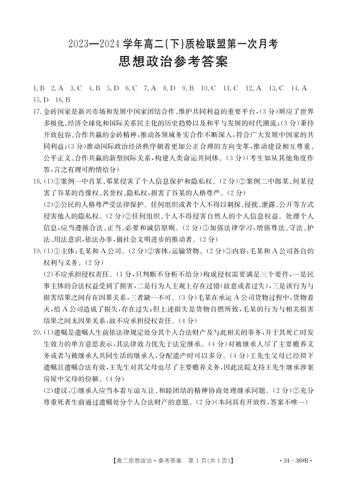 河北省邢台市名校联盟2023-2024学年高二下学期3月月考政治答案