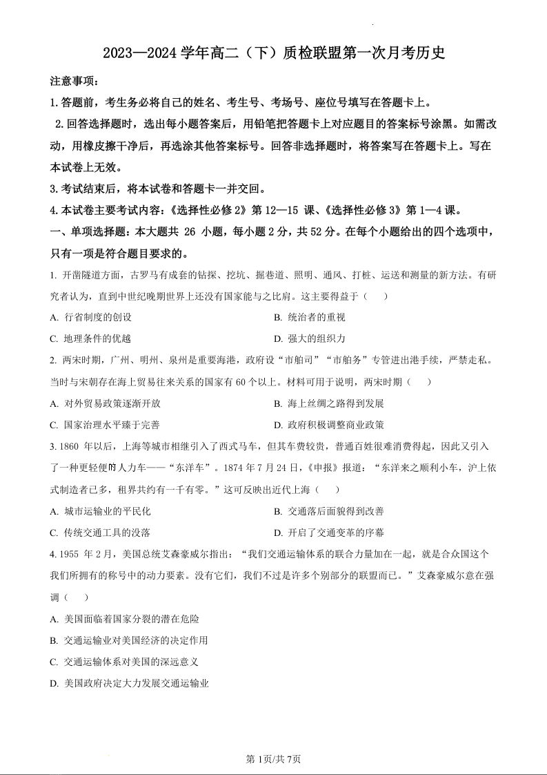 河北省邢台市名校联盟2023-2024学年高二下学期3月月考历史(原卷版)