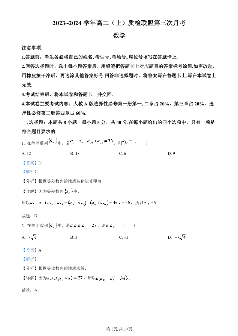 河北省邢台市四校联盟2023-2024学年高二上学期第三次月考数学(精品解析版)