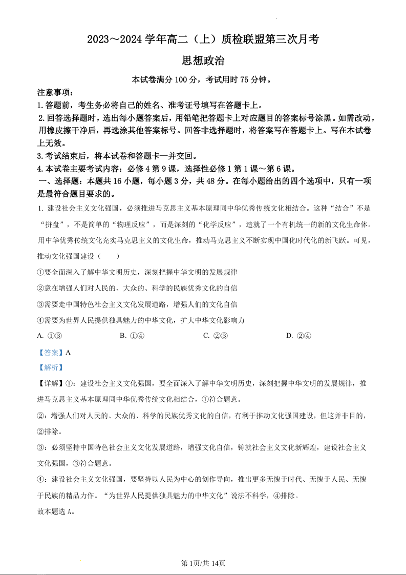 河北省邢台市四校联盟2023-2024学年高二上学期第三次月考政治(精品解析版)