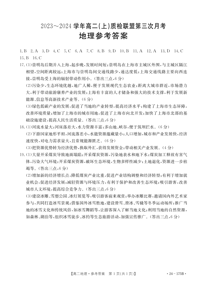 河北省邢台市四校联盟2023-2024学年高二上学期第三次月考地理答案