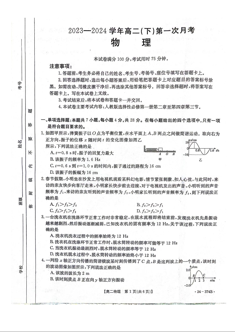 河北省邢台市五岳联盟2023-2024学年高二下学期3月月考物理