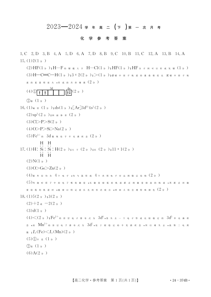 河北省邢台市五岳联盟2023-2024学年高二下学期3月月考化学答案