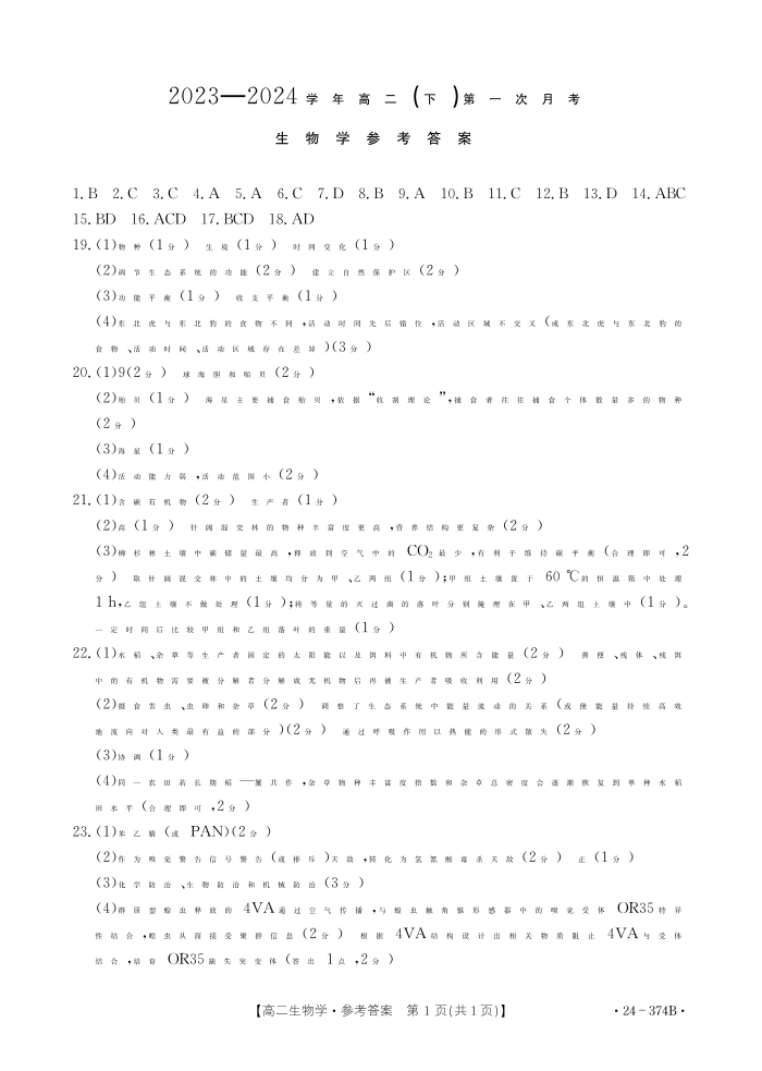 河北省邢台市五岳联盟2023-2024学年高二下学期3月月考生物答案