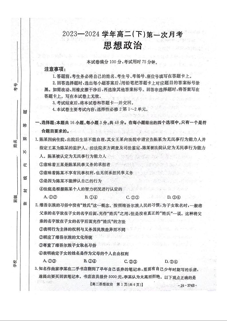 河北省邢台市五岳联盟2023-2024学年高二下学期3月月考政治