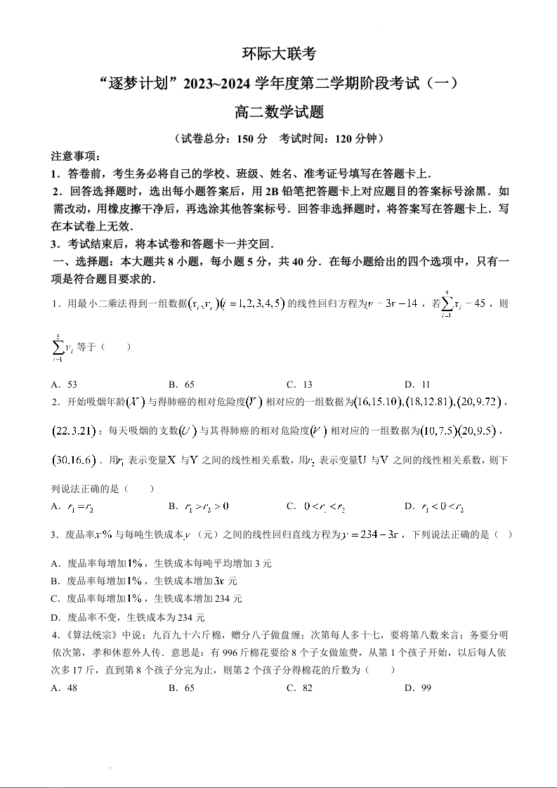 河南省驻马店市2023-2024学年高二下学期阶段考试(一)3月月考数学+答案