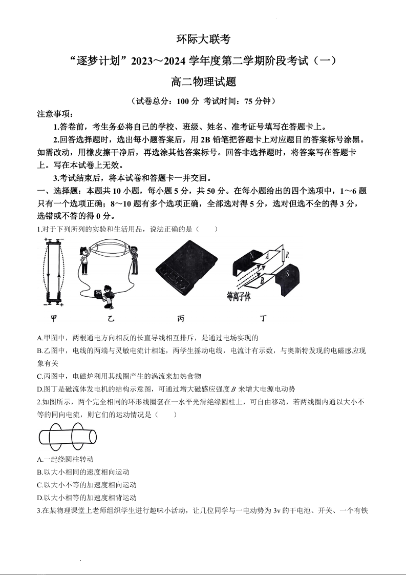 河南省驻马店市2023-2024学年高二下学期阶段考试(一)3月月考物理+答案