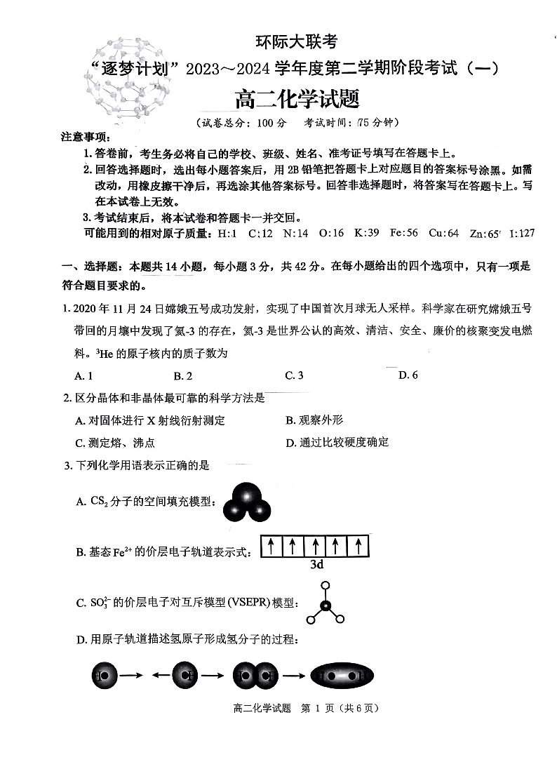 河南省驻马店市2023-2024学年高二下学期阶段考试(一)3月月考化学