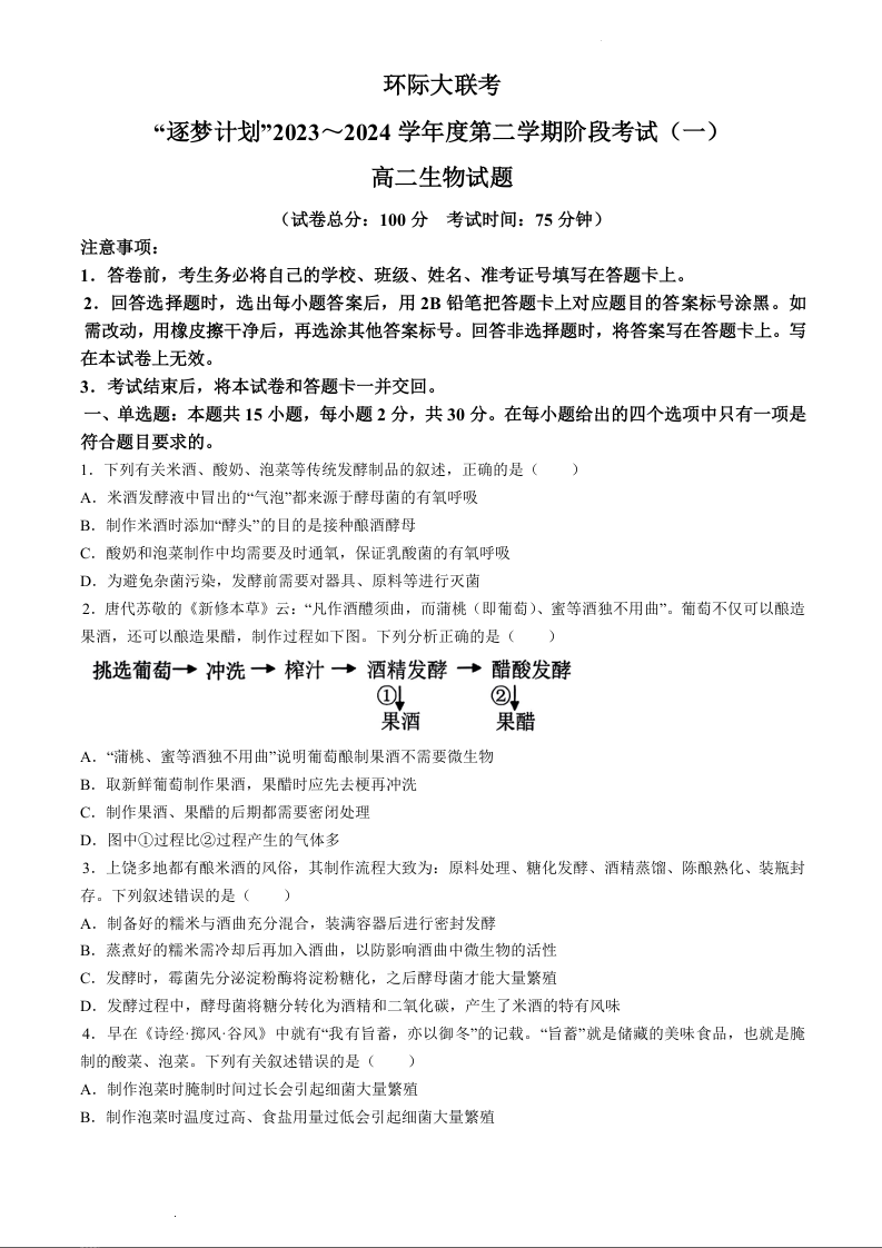 河南省驻马店市2023-2024学年高二下学期阶段考试(一)3月月考生物+答案