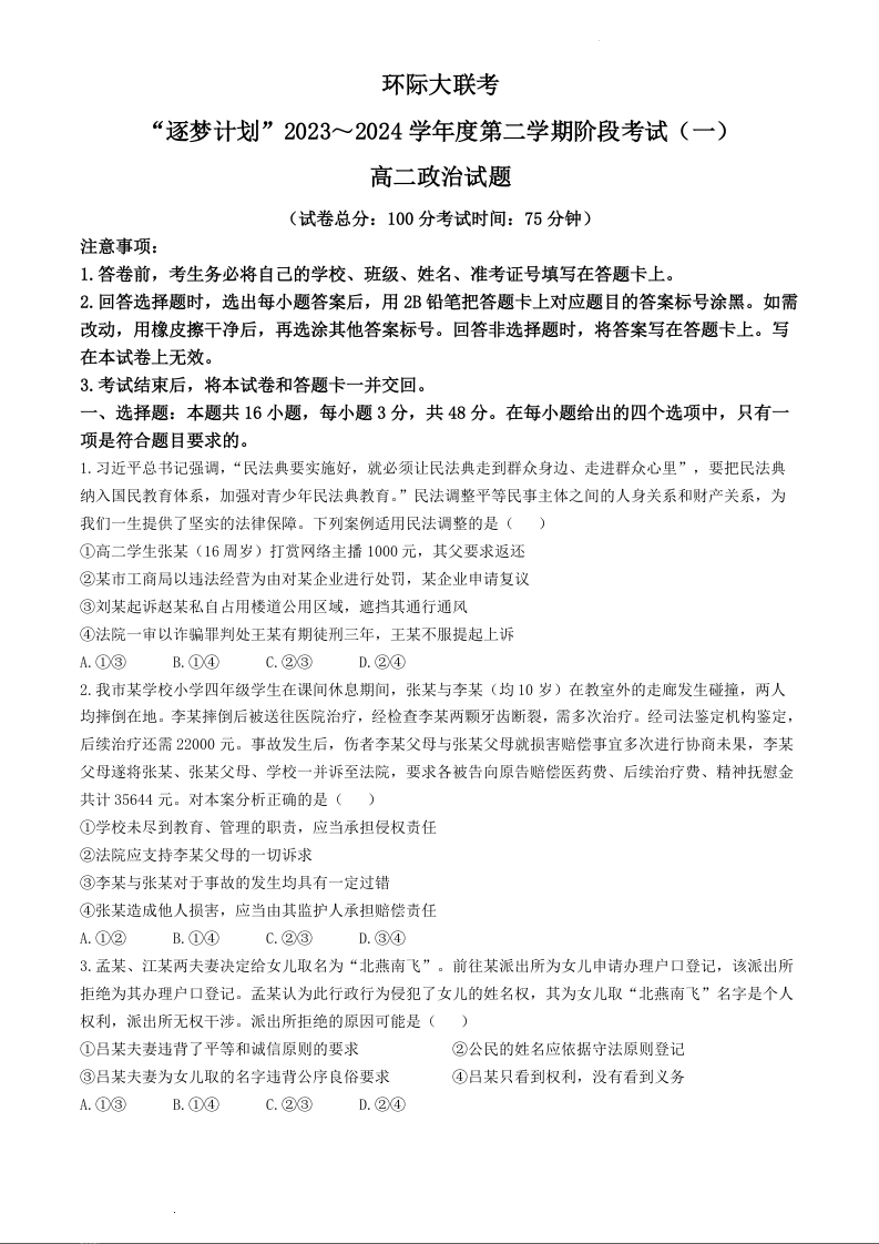 河南省驻马店市2023-2024学年高二下学期阶段考试(一)3月月考政治+答案
