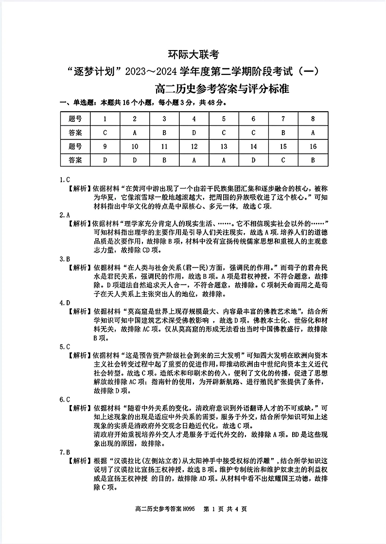 河南省驻马店市2023-2024学年高二下学期阶段考试(一)3月月考历史答案