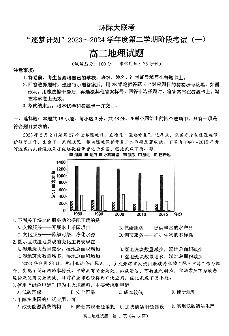 河南省驻马店市2023-2024学年高二下学期阶段考试(一)3月月考地理
