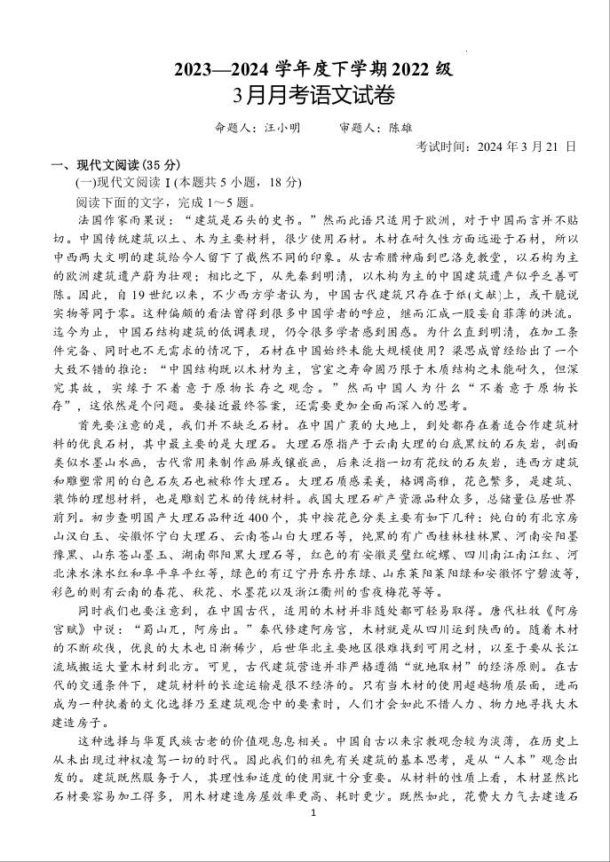 湖北省沙市中学2023-2024学年高二下学期3月月考语文