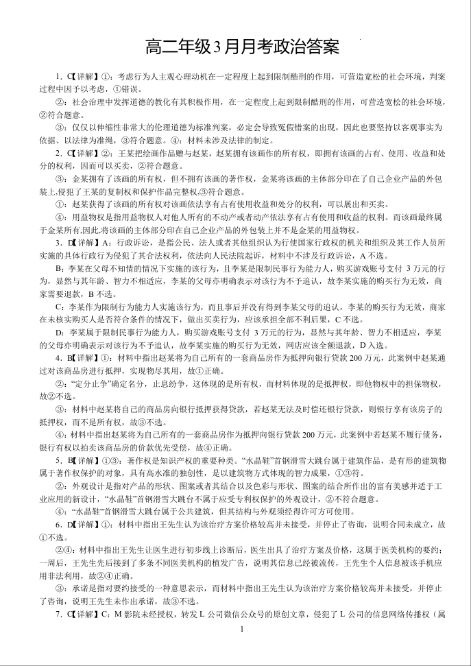 湖北省沙市中学2023-2024学年高二下学期3月月考政治答案