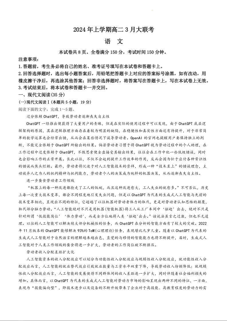湖南省天壹名校联盟2023-2024学年高二下学期3月月考语文+答案