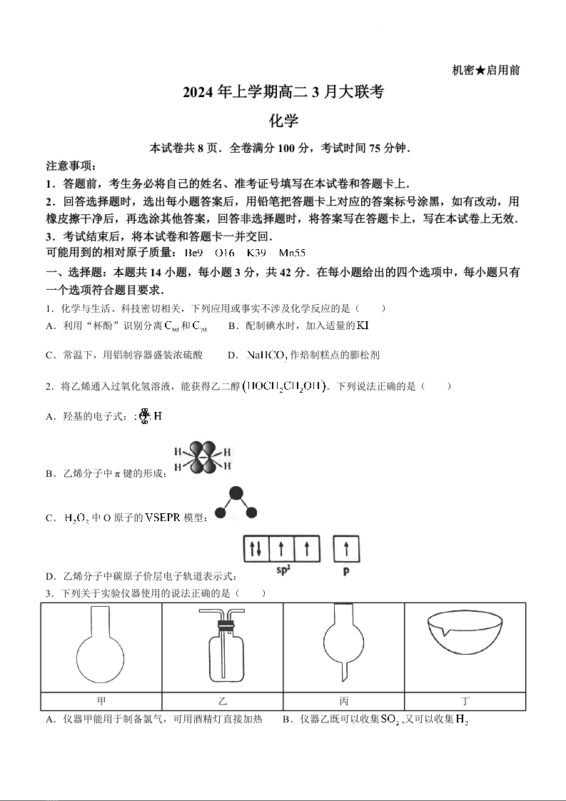 湖南省天壹名校联盟2023-2024学年高二下学期3月月考化学+答案