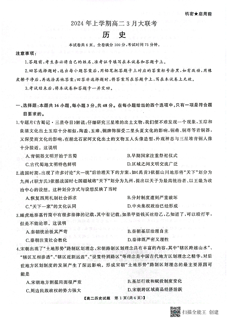 湖南省天壹名校联盟2023-2024学年高二下学期3月月考历史