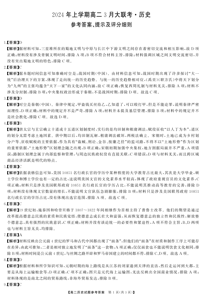 湖南省天壹名校联盟2023-2024学年高二下学期3月月考历史答案