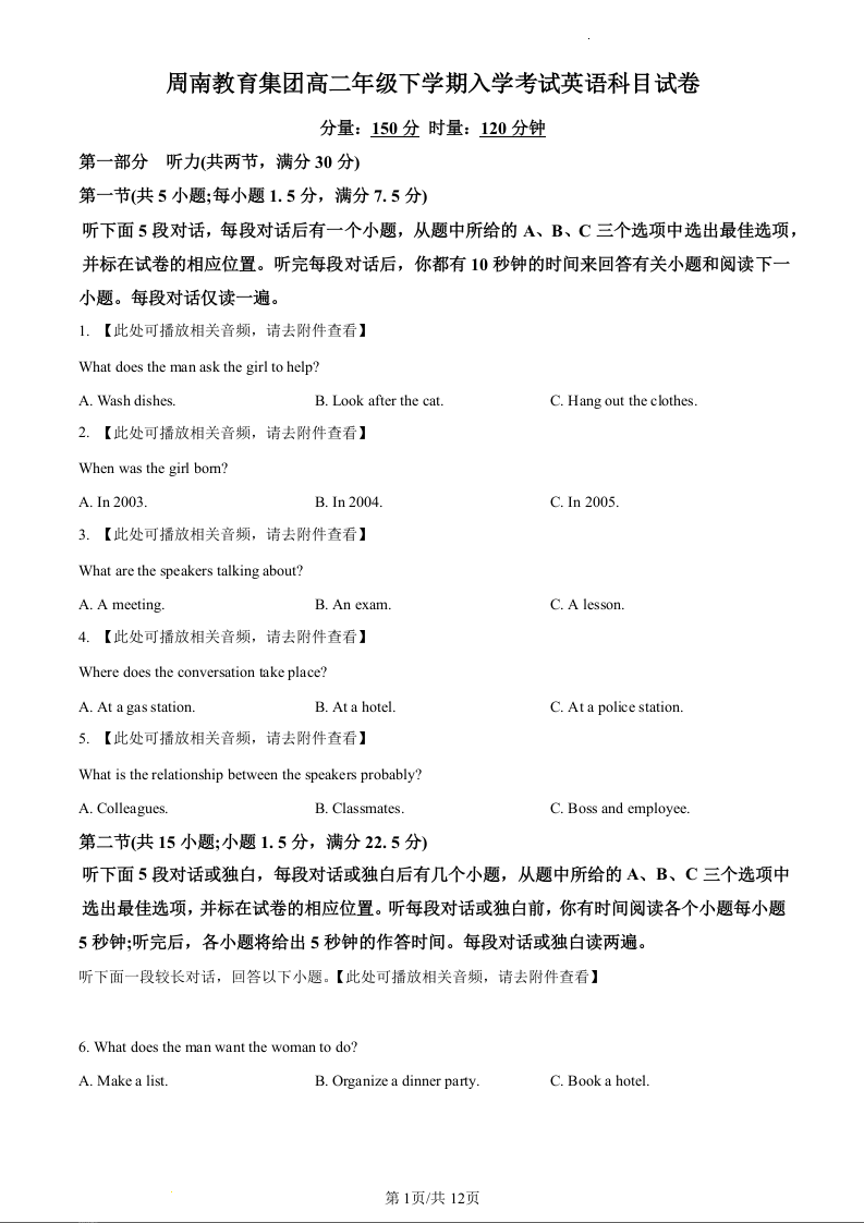 湖南省长沙市周南教育集团2023-2024学年高二下学期入学考试英语(原卷版)