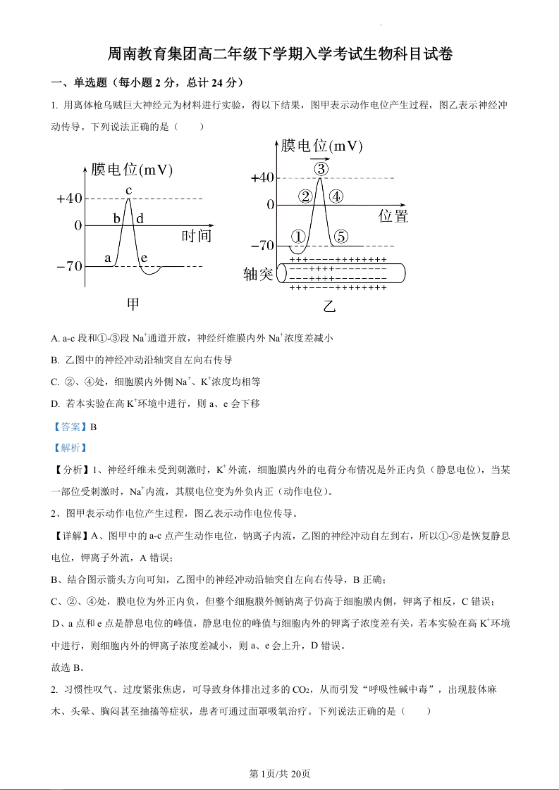 湖南省长沙市周南教育集团2023-2024学年高二下学期入学考试生物(精品解析版)