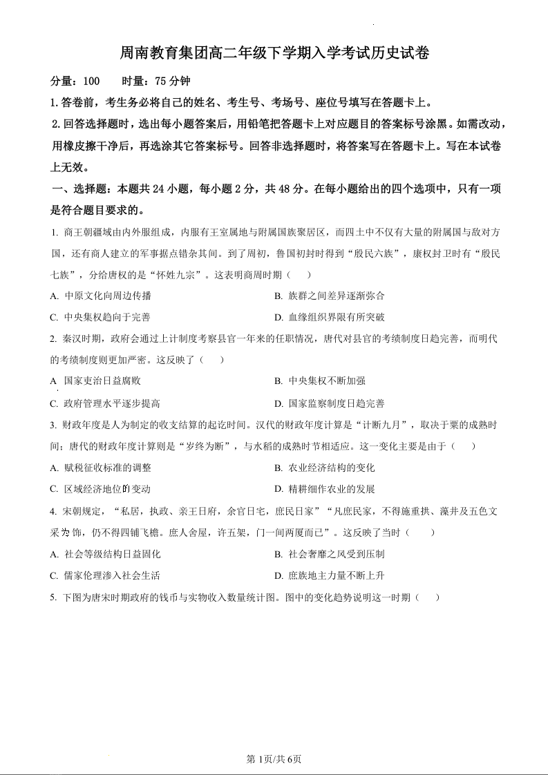 湖南省长沙市周南教育集团2023-2024学年高二下学期入学考试历史(原卷版)