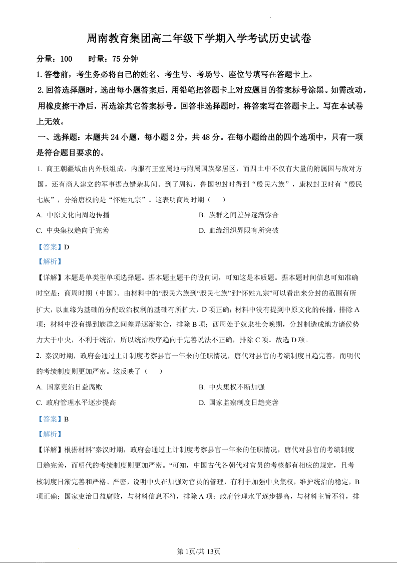 湖南省长沙市周南教育集团2023-2024学年高二下学期入学考试历史(精品解析版)