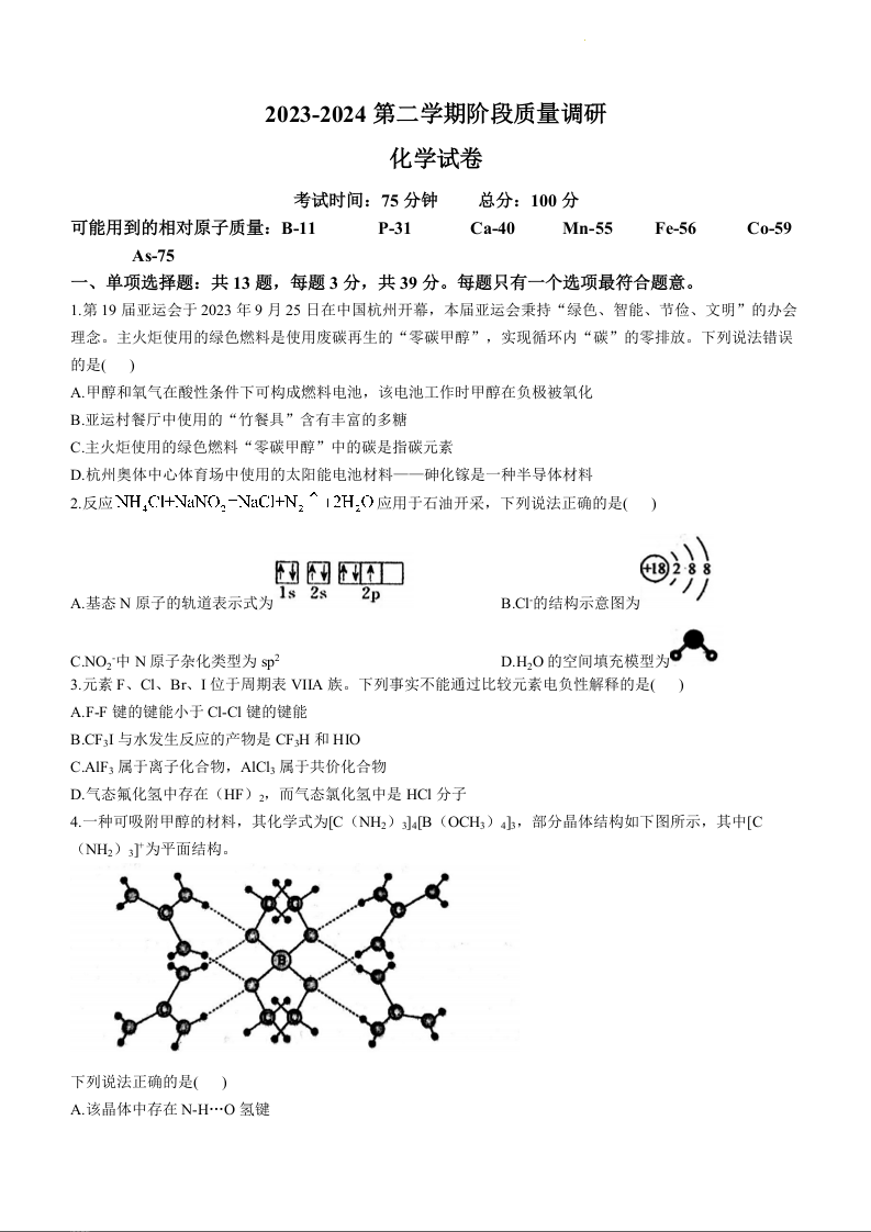 江苏省南菁高中、常州一中2023-2024学年高二下学期3月月考化学