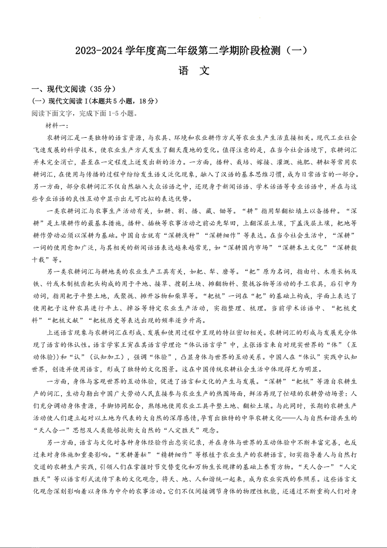 江苏省南通市海安高级中学2023-2024学年高二下学期阶段检测(一)语文+答案