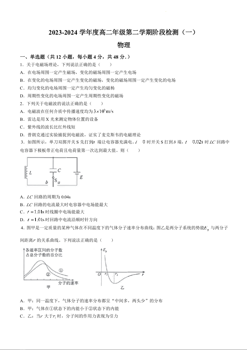 江苏省南通市海安高级中学2023-2024学年高二下学期阶段检测(一)物理+答案