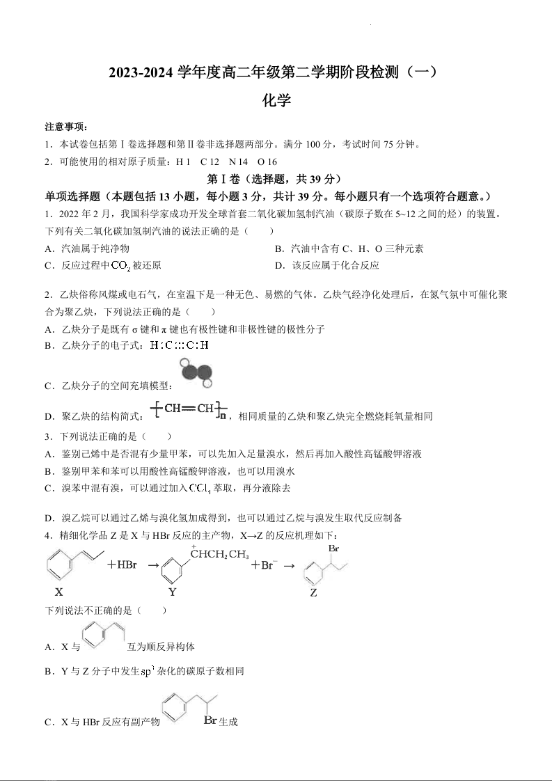 江苏省南通市海安高级中学2023-2024学年高二下学期阶段检测(一)化学+答案