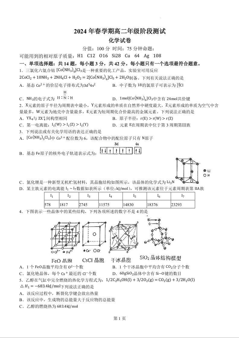 江苏省射阳中学2023-2024学年高二下学期3月阶段测试化学+答案