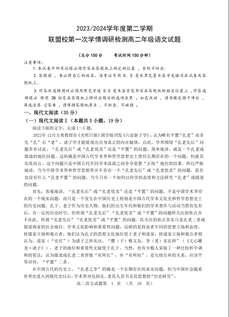 江苏省盐城市五校联盟2023-2024学年高二下学期第一次学情调研检测语文