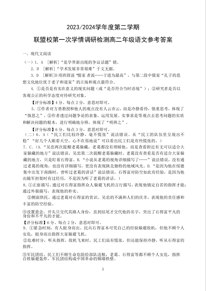 江苏省盐城市五校联盟2023-2024学年高二下学期第一次学情调研检测语文答案