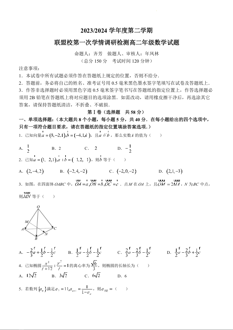 江苏省盐城市五校联盟2023-2024学年高二下学期第一次学情调研检测数学+答案