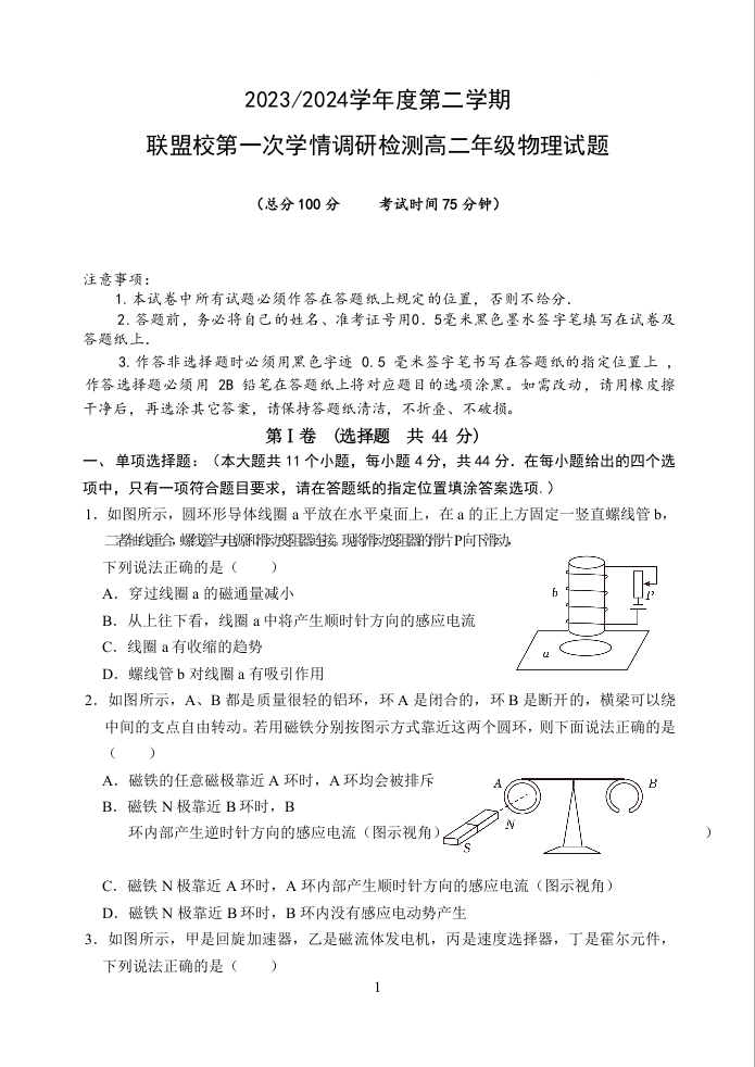 江苏省盐城市五校联盟2023-2024学年高二下学期第一次学情调研检测物理