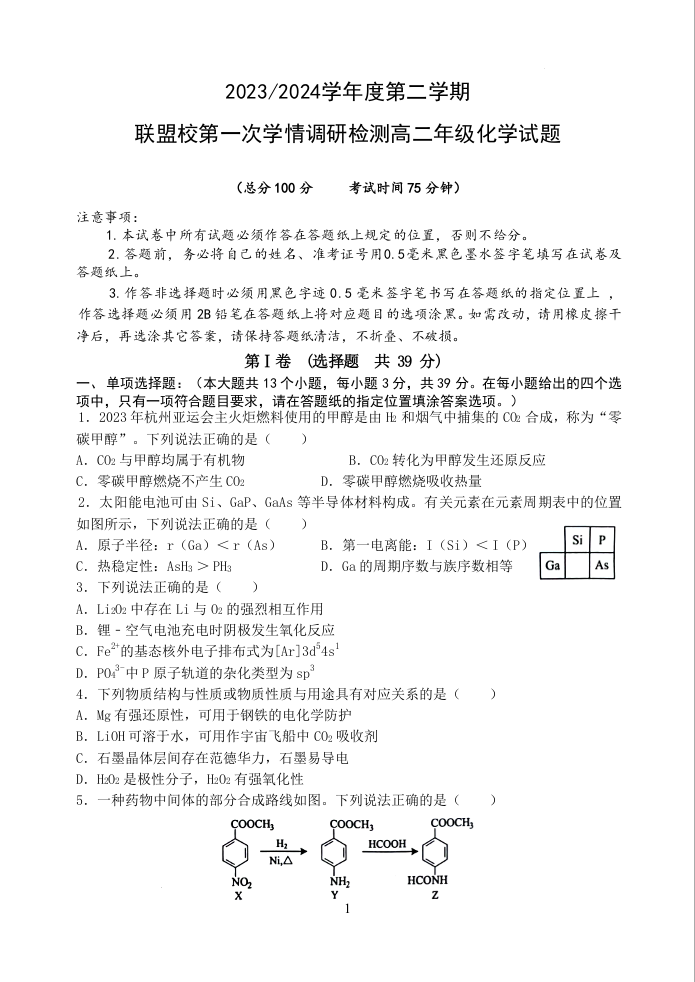 江苏省盐城市五校联盟2023-2024学年高二下学期第一次学情调研检测化学