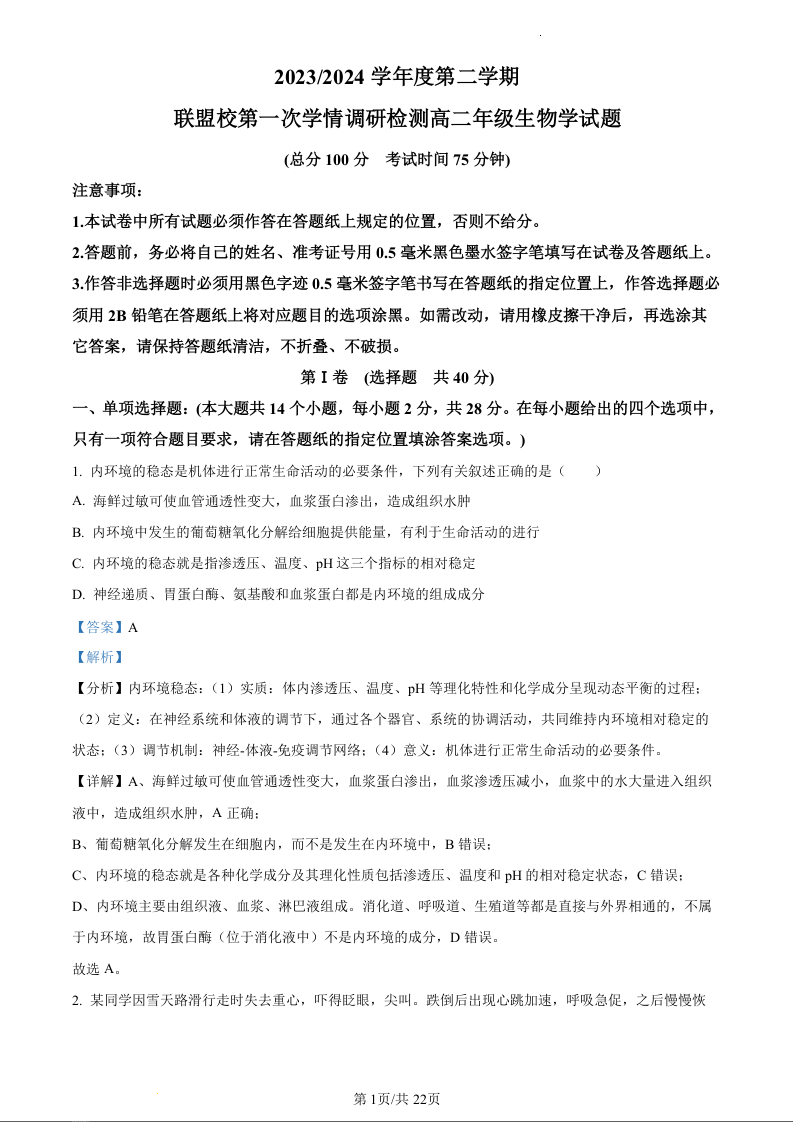 江苏省盐城市五校联盟2023-2024学年高二下学期第一次学情调研检测生物(精品解析版)