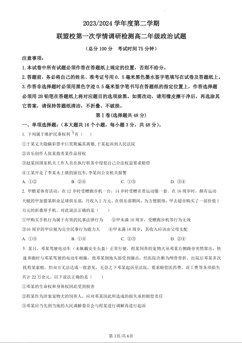 江苏省盐城市五校联盟2023-2024学年高二下学期第一次学情调研检测政治(原卷版)