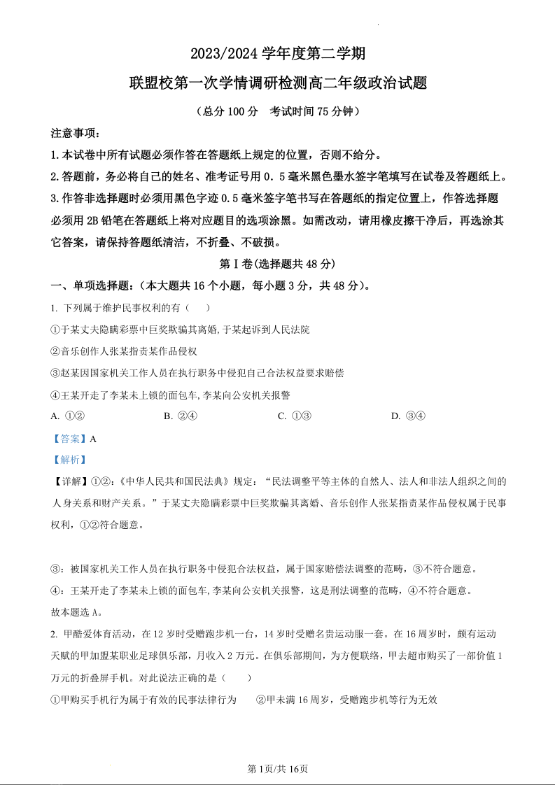 江苏省盐城市五校联盟2023-2024学年高二下学期第一次学情调研检测政治(精品解析版)