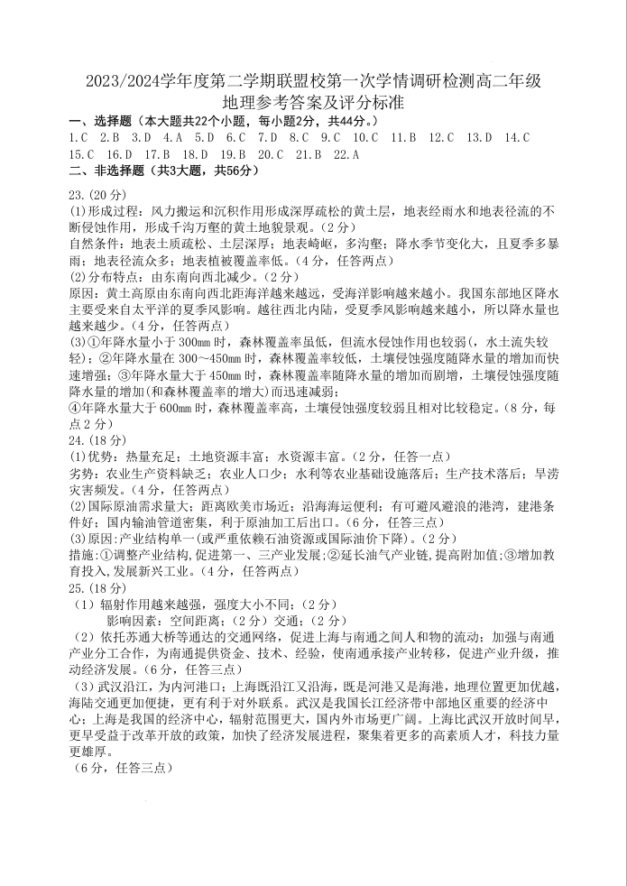江苏省盐城市五校联盟2023-2024学年高二下学期第一次学情调研检测地理答案